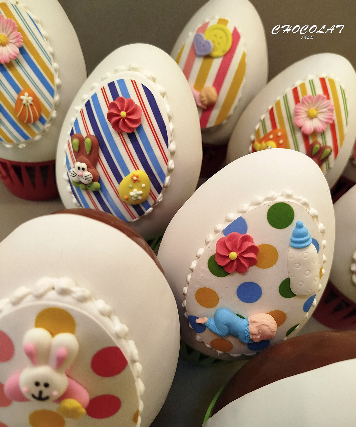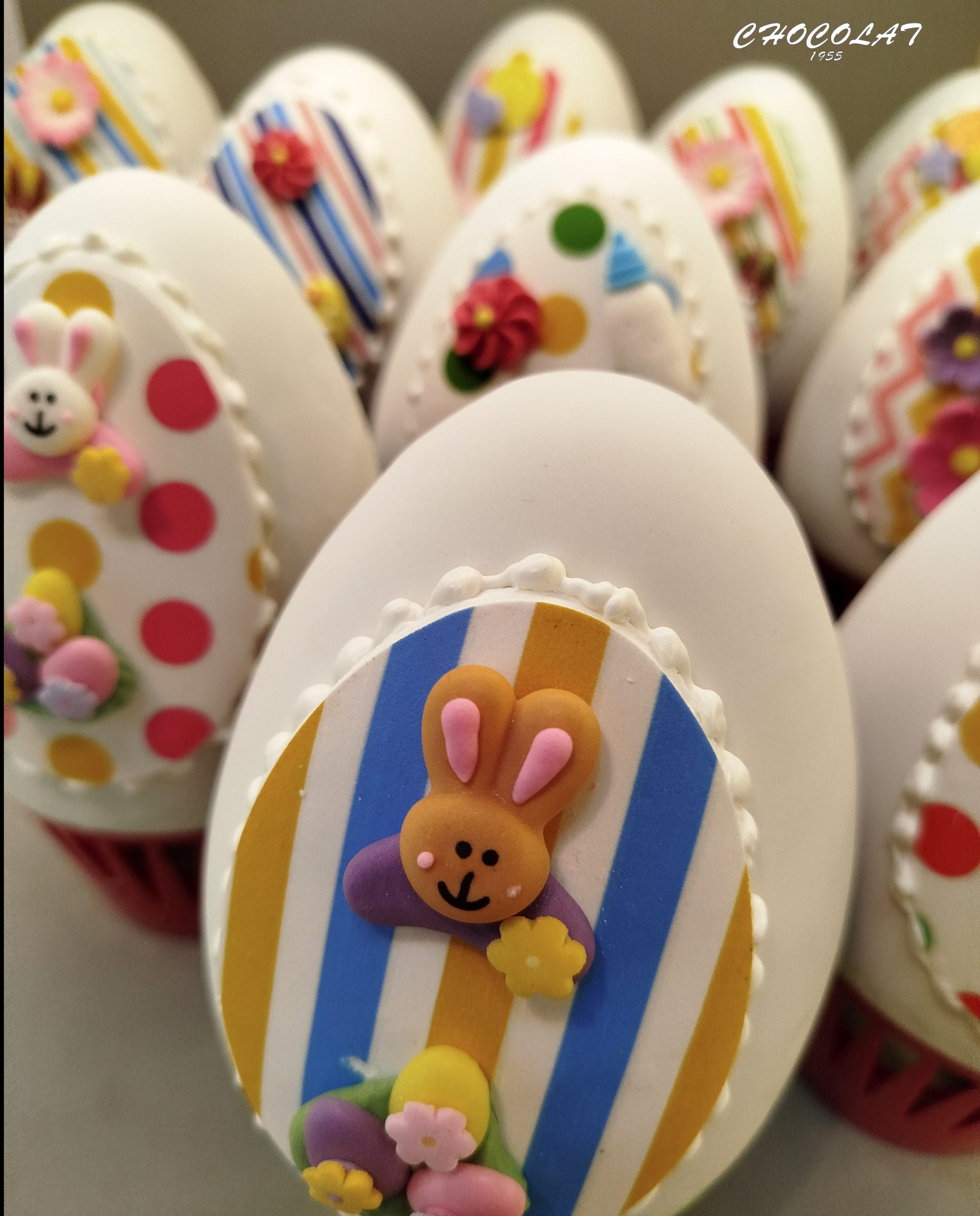 Σοκολατένια αυγά με σοκολάτα γάλακτος εξαιρετικής ποιότητας σε διάφορα σχέδια για τα παιδιά αλλά και τους μεγάλους. Μπισκότοτα ζαχαρόπαστας σε πασχαλινά, αγαπημένα σχέδια.